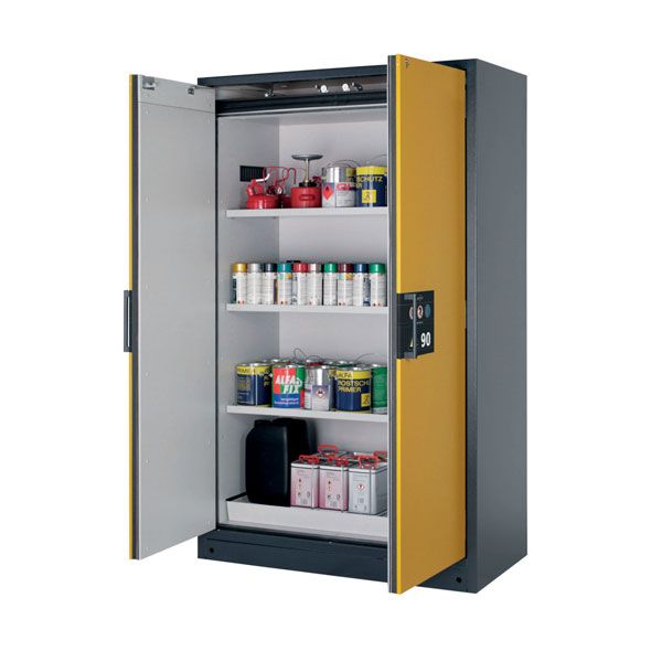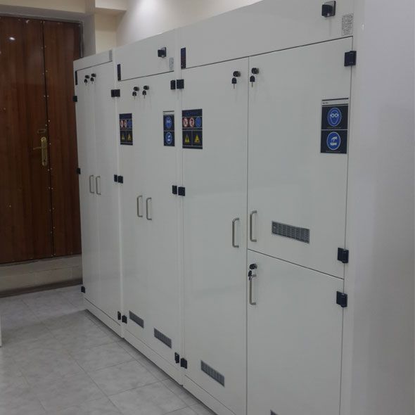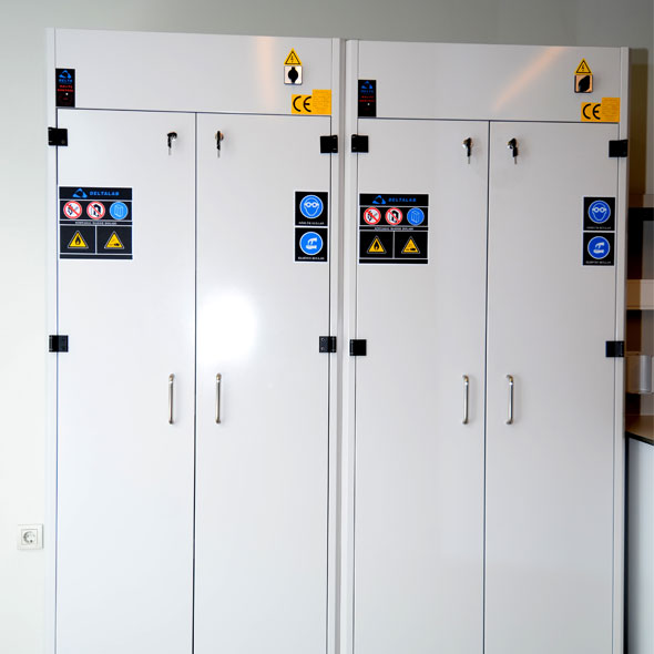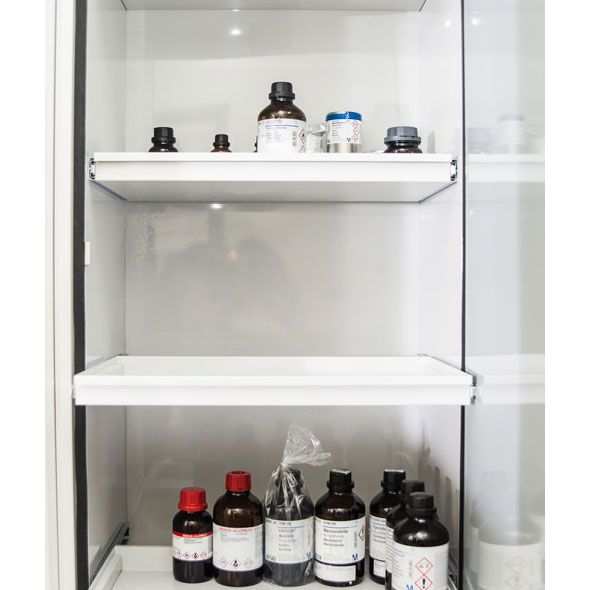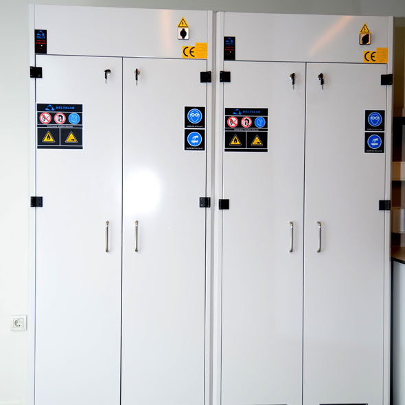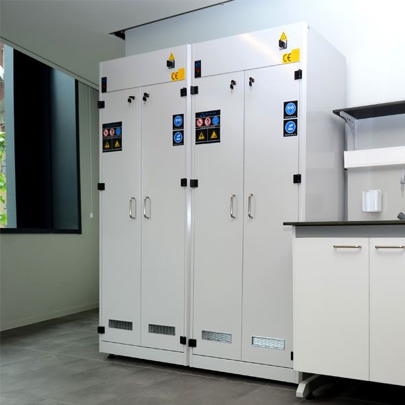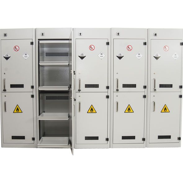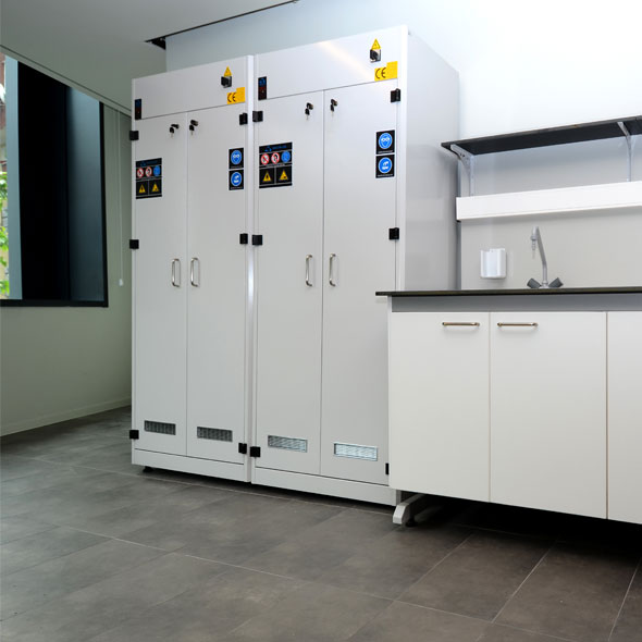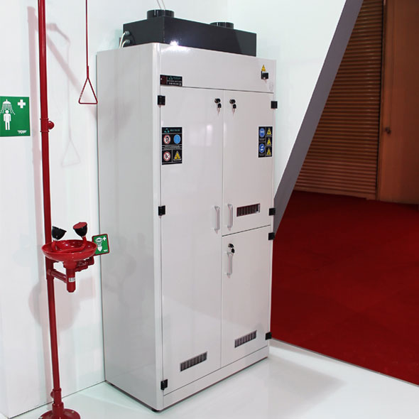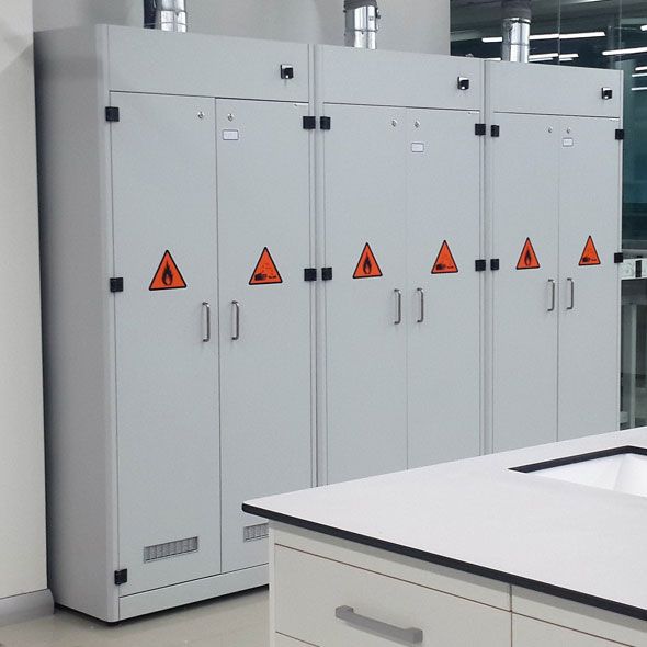 خزانات تخزين المواد الكيميائية هي واحدة من أثاث المختبرات الذي ال غنى عنه. تخزين كيميائي غير آمن ؛ قد يتسبب في مواقف تعرض السالمة في مكان العمل للخطر مثل الحرارة والنار واالنفجار وتسرب الغازات السامة. تُستخدم خزانات تخزين المواد الكيميائية لتخزين المواد الكيميائية بأمان بكميات متفاوتة داخل المختبر بشكل قياسي. خزانات تخزين المواد الكيميائية عبارة عن أثاث مستودعات تستخدم بشكل شائع من قبل المختبرات الكيميائية أو شركات األدوية لتخزين المواد الكيميائية السائبة. تصنع هذه الخزانات عادة من مواد مقاومة للمواد الكيميائية المخزنة بالداخل ، ويفضل البولي بروبلين في .كثير من األحيان لمنع التآكل
